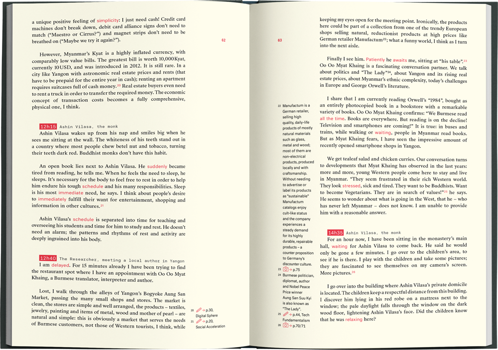 A cross between a research study and a design book, In Search of Lost Time is a dialogue between a social scientist and a visual designer. Originally researched and written as an academic paper, the goal of this book is to make academic thinking broadly accessible and easy to digest, and to display, embody, and represent human’s experience of time in the form of a beautiful object.