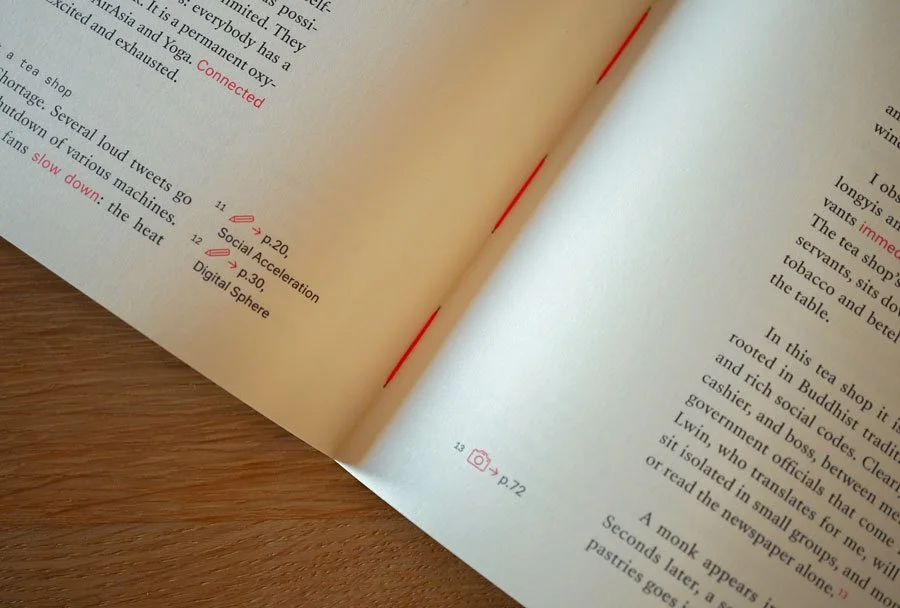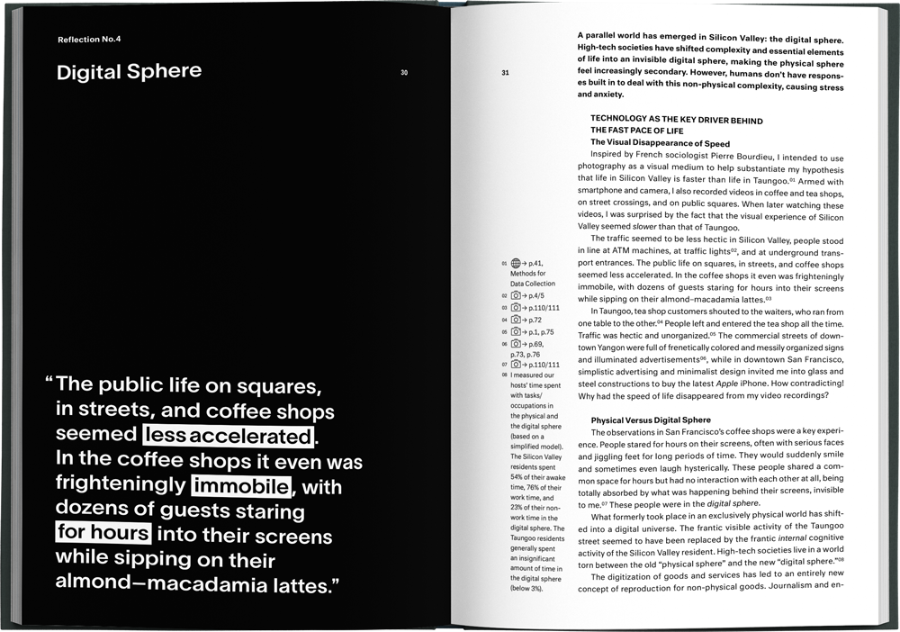 By making a distinction between observations and analysis — the immersive content in a premium-feel Volume 1, the reflective content in a more simple, clean Volume 2 — we provide a nudge to readers to fill the space between the two modes of thought with their own ideas.